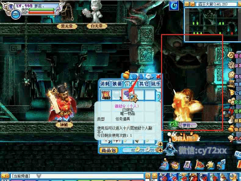 🎭前置!地狱18层副本Header 1Header 2首先到南天门找巡天神将传送阎王大殿。然后找钟馗接任务!在红色框框地方使用镇狱令。地狱18层需要一关一关的过,清完小怪才会出来BOSS,是升仙装备的各种材料!