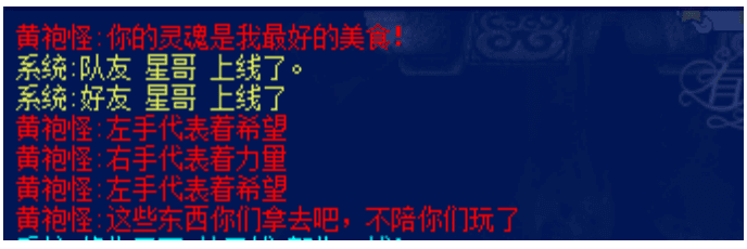 机关是之前三星副本的激光机关。不同的是,激光会往左或者往右,出激光的时候有台词,根据台词可以看出激光是往左还是往右,但是,看台词还是反应不过来,可以直接跳一下来躲避激光。 如果被激光打中并传送到本图左下角,可能触发一个 BUG,角色无法动弹,这个时候只需要按 ESC 选择人物就可以了。 当出现如图的最后一句台词的时候,黄袍怪就丢下东西逃跑了。不要管它,捡东西就是了。 据说如果全队的咒系抗性过高,黄袍怪不会逃跑,而是会现出真身奎木狼,就是神兽卡的外形,这一点作者没有得到实际证实,等有好心人证实之后会更新这一段。 | ![]() |