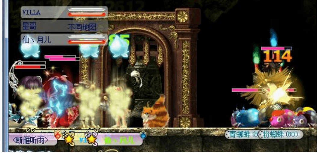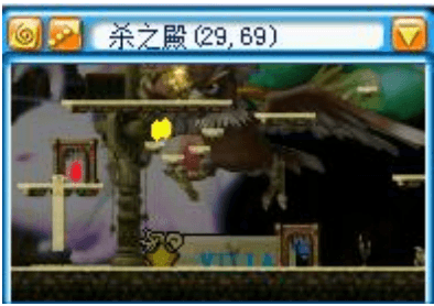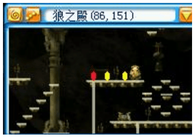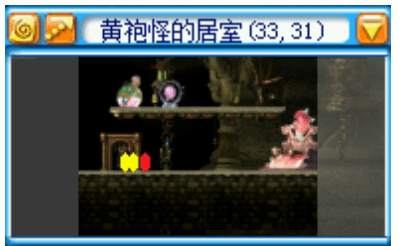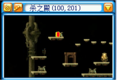 进入 BOSS 房,黄袍怪的居室。平台上面是安全的,平台下面有两个 BOSS,红色小奎星和白色小奎星。 这个图的下层会定时随机刷新怪物,包括白狐狸,蜘蛛,蛇妖,大冰狼,黄金力士(脸黑遇到刷新这个就可以考虑翻车了),所以本图很讲究站位。 | ![]() |
