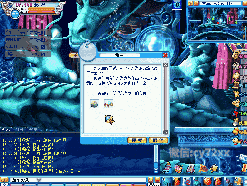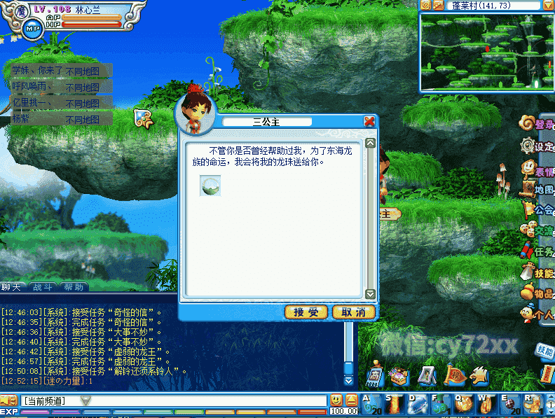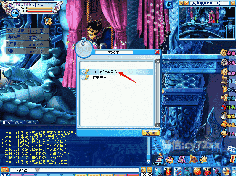 渔村神秘和尚对话后–长安菩提老祖对话—-龙宫龙王对话—接着跟旁边的龙公主对话接任务。任务名字:解铃还须系铃人 | ![]() |