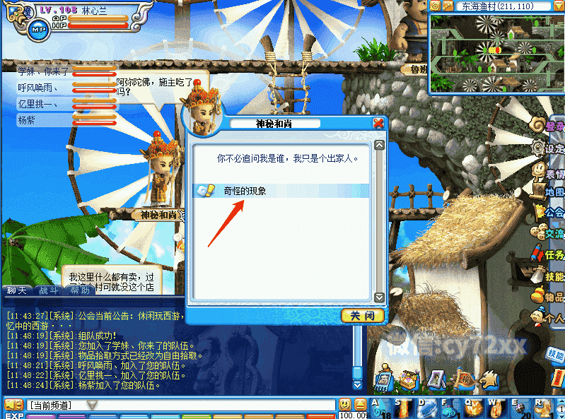 找到渔村的神秘和尚接任务,任务名字:奇怪的现象 | ![]() |
