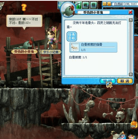 ![]() | 提示:白骨郎君在白骨洞6,不过不好刷,在6刷的时候一定要刷上面的怪,刷完上面的怪,郎君才会出来,还有一点就是,过这个任务的时候一定要有耐心。 可换线找找郎君,打死拿任务道具-骨头。 |