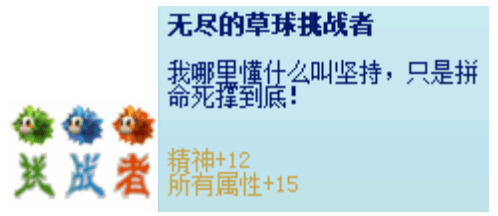 无尽的草球副本又名无尽的狼公公,无尽的死亡,是新增加的副本,也是普通玩家的非常好的加属性的称号----无尽的草球挑战者的来源,无尽的草球挑战者称号加全属性和精神,很实用,如图 13-14 所示。这也是唯一一个必须关闭特效和队友伤害否则会卡死的副本。