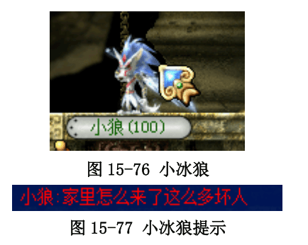 在两个平台中间的小台阶上会刷新 1 只小冰狼,一眼就能看出很明显是小冰狼,如图 15-76 所示,这只小冰狼可以击杀也可以不击杀,如果打死它,每隔一段时间会重新刷新一只,同时聊天框出现提示,如图 15-77 所示。这只小冰狼会每隔一段时间给其中一个 BOSS 冰狼加血,而且是在这只冰狼死之前就只给这一只加,所以有时候并不需要理它。 | ![]() |