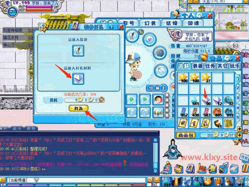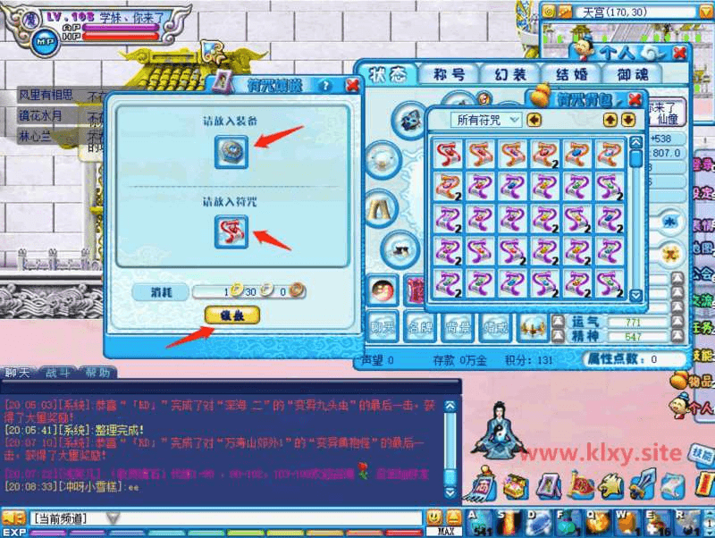 符咒镶嵌 | 装备放上面,符文放下面,可以给装备镶嵌符文,必须要有孔的升仙装备才行。没孔的先打孔! | ![]() |