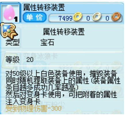 属性转移装置是一种道具,包括空装置和带属性的装置。空装置可以对带属性的白装使用,概率提取其中一条属性到装置中,有提取神佑可以必定提取成功。带属性的装置能且仅能将属性注入变身卡,注入必定成功。 | ![]() |