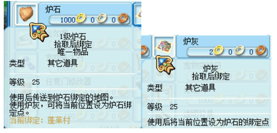 炉石是一种传送道具,相当于定点土地符,唯一物品,无限使用,有冷却,更改地点使用炉灰,在蓬莱村张韶涵处有售。副本地图不能作为炉石的目的地图。 | ![]() |
