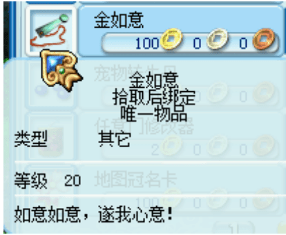 金如意是一种强化辅助道具,在蓬莱村张韶涵处有售,本身 100 金币,强化不同的东西每次需要额外花费。 目前金如意可以强化的有:菩提宝瓶(每次 100 金币增加 100回蓝量,无强化上限),甘露葫芦(每次 100 金币减少 10 秒冷却),炉石(减少冷却),76任意门(减少冷却)。金如意强化有风险,友情提示,请勿轻易尝试。 | ![]() |