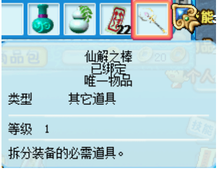 仙解之棒是本游戏唯一的分解道具,由五星副本的黄袍 2 唯一掉落,唯一物品,拾取绑定,无限使用,可以分解无法卖给 NPC 的装备,战宠,时装等等。 | ![]() |