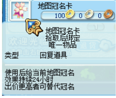 地图冠名卡是新增的道具,拾取绑定,唯一物品,蓬莱村张韶涵处有售,类似于幻影壁,给一个地图冠名,达到宣传的作用。冠名起拍价 500 金币,有效期至下一位更高78出价或者 24 小时自然时间。 | ![]() |