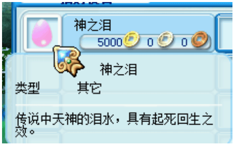 神之泪是一种很多任务、活动和合成需要的任务道具,只做任务用,本身没有任何作用,变化师村招财使者以及其他 NPC 有售,5000 金币一个,特别的,饿狼传说副本也会掉落。 | ![]() |
