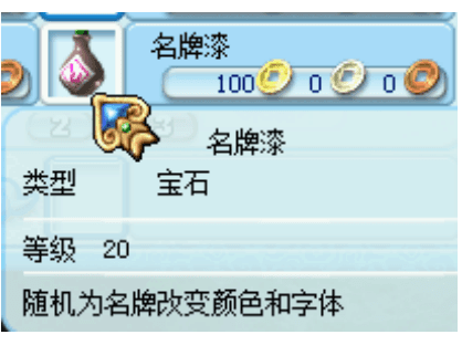 名牌漆是改变名片字体、字号和颜色的,也是幻化装备需要的任务品,蓬莱村张韶涵有售。100 级以上找变化师村招财使者可以使用名牌漆换声望,也可以找伍圣轩沙僧用名牌漆换成就。 | ![]() |