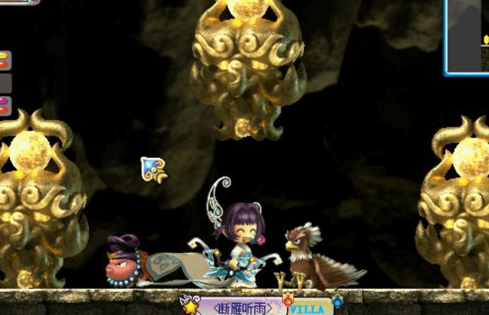 飞过去之后还是一样,在靠近左边墙的地方通过快乐贴往左飞,如图的位置,互相贴快乐贴,被贴的人一直按右,没有被贴的在旁边一直跳。但是飞过去有一个冰狼,打死就可以了。 | ![]() |